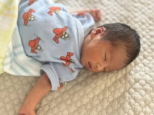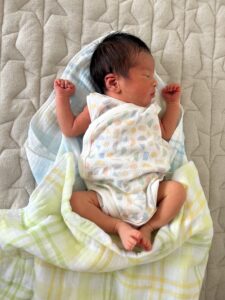病院で肌着+おくるみ+布団だったから、それが正しいのかと思ってたけど、ちょっと暑いのかな…。大人の肌寒いくらいがちょうど良いらしい。